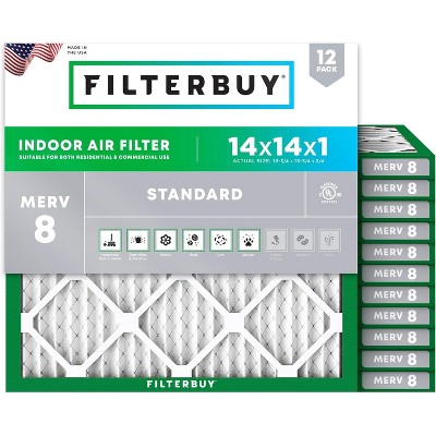 The Filterbuy replacement air filter 14x14x1 (actual size: 13.75" x 13.75" x 0.75") ensures that your furnace, air conditioner, heat pump, or HVAC system is circulating the cleanest air possible to help preserve your budget and healthy lifestyle. MERV 13 synthetic media (comparable with Healthy Living Ultimate Allergen Defense MPR 1900 & FPR 10) is recommended if you have a respiratory illness (such as asthma) with its capability to trap 98% of dust particles while protecting your home or business from bacteria, smoke, smog, lint, pollen, mold, dander, and other forms of debris without impacting air flow. High quality construction features an electrostatically charged design with 16 pleats per foot that captures more harmful particles and prolongs the products lifespan by three times that of fiberglass models (replace every 90 days for best results). Plus, our industrial grade beverage board frames are paired with dual wire backings that significantly outperform traditional cardboard compositions by improving structural integrity with their ability to endure temperatures up to 200 degrees Fahrenheit and withstand exposure to moisture. Installation is also made simple with the addition of easy-to-understand arrows that help identify the direction of air flow and subsequently the way the filter needs to be placed. To top it off, all our components are 100% manufactured within the United States and designed with recyclable materials, providing an eco-friendly alternative to enhancing your air quality.