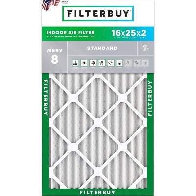 The Filterbuy replacement air filter 16x25x2 (actual size: 15.50" x 24.50" x 1.75") ensures that your furnace, air conditioner, heat pump, or HVAC system is circulating the cleanest air possible to help preserve your budget and healthy lifestyle. MERV 11 synthetic media (comparable with Micro Allergen Defense MPR 1200 & FPR 7) is recommended if you have pets or allergies with its capability to trap 95% of dust particles while protecting your home or business from smoke, smog, lint, pollen, mold, dander, and other forms of debris without impacting air flow. High quality construction features an electrostatically charged design with 10 pleats per foot that captures more harmful particles and prolongs the products lifespan by three times that of fiberglass models (replace every 90 days for best results). Plus, our industrial grade beverage board frames are paired with dual wire backings that significantly outperform traditional cardboard compositions by improving structural integrity with their ability to endure temperatures up to 200 degrees Fahrenheit and withstand exposure to moisture. Installation is also made simple with the addition of easy-to-understand arrows that help identify the direction of air flow and subsequently the way the filter needs to be placed. To top it off, all our components are 100% manufactured within the United States and designed with recyclable materials, providing an eco-friendly alternative to enhancing your air quality.