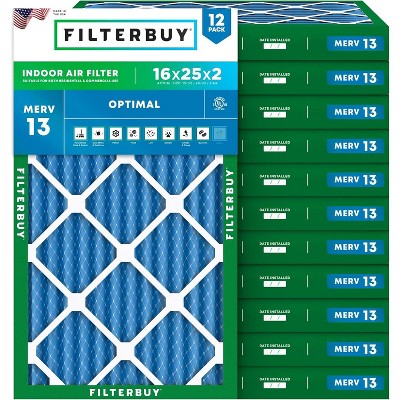 The Filterbuy replacement air filter 16x25x2 (actual size: 15.50" x 24.50" x 1.75") ensures that your furnace, air conditioner, heat pump, or HVAC system is circulating the cleanest air possible to help preserve your budget and healthy lifestyle. MERV 13 synthetic media (comparable with Healthy Living Ultimate Allergen Defense MPR 1900 & FPR 10) is recommended if you have a respiratory illness (such as asthma) with its capability to trap 98% of dust particles while protecting your home or business from bacteria, smoke, smog, lint, pollen, mold, dander, and other forms of debris without impacting air flow. High quality construction features an electrostatically charged design with 14 pleats per foot that captures more harmful particles and prolongs the products lifespan by three times that of fiberglass models (replace every 90 days for best results). Plus, our industrial grade beverage board frames are paired with dual wire backings that significantly outperform traditional cardboard compositions by improving structural integrity with their ability to endure temperatures up to 200 degrees Fahrenheit and withstand exposure to moisture. Installation is also made simple with the addition of easy-to-understand arrows that help identify the direction of air flow and subsequently the way the filter needs to be placed. To top it off, all our components are 100% manufactured within the United States and designed with recyclable materials, providing an eco-friendly alternative to enhancing your air quality.