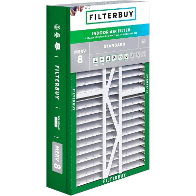 The Filterbuy replacement whole house air filter 17.5x27x5 (actual size: 17.13" x 26.13" x 4.97") ensures that your furnace, air conditioner, heat pump, or HVAC system is circulating the cleanest air possible to help preserve your budget and healthy lifestyle. MERV 8 synthetic media (comparable with Clean Living Dust Defense MPR 700 & FPR 5) is recommended in most scenarios with its capability to trap 90% of dust particles while protecting your home or business from lint, pollen, mold, dander, and other forms of debris without impacting air flow. High quality construction features an electrostatically charged design with 8 pleats per foot that captures more harmful particles and prolongs the products lifespan by three times that of fiberglass models (replace every 90 days for best results). Plus, our industrial grade beverage board frames are paired with dual wire backings that significantly outperform traditional cardboard compositions by improving structural integrity with their ability to endure temperatures up to 200 degrees Fahrenheit and withstand exposure to moisture. Installation is also made simple with the addition of easy-to-understand arrows that help identify the direction of air flow and subsequently the way the filter needs to be placed. To top it off, all our components are 100% manufactured within the United States and designed with recyclable materials, providing an eco-friendly alternative to enhancing your air quality.