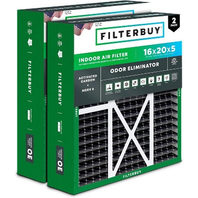 The Filterbuy replacement whole house air filter 20x25x6 (actual size: 19.75" x 24.25" x 6.00") ensures that your furnace, air conditioner, heat pump, or HVAC system is circulating the cleanest air possible to help preserve your budget and healthy lifestyle. Odor Eliminator MERV 8 synthetic media (comparable with Clean Living Odor Defense MPR 700 & FPR 5) is recommended to prevent undesirable smells from food, smoke, pets, and other sources. This does not take away from its ability to trap 90% of dust particles while protecting your home or business from lint, pollen, mold, dander, and other forms of debris without impacting air flow. High quality construction features an electrostatically charged design with 11 pleats per foot that captures more harmful particles and prolongs the products lifespan by three times that of fiberglass models (replace every 90 days for best results). Plus, our industrial grade beverage board frames are paired with dual wire backings that significantly outperform traditional cardboard compositions by improving structural integrity with their ability to endure temperatures up to 200 degrees Fahrenheit and withstand exposure to moisture. Installation is also made simple with the addition of easy-to-understand arrows that help identify the direction of air flow and subsequently the way the filter needs to be placed. To top it off, all our components are 100% manufactured within the United States and designed with recyclable materials, providing an eco-friendly alternative to enhancing your air quality.