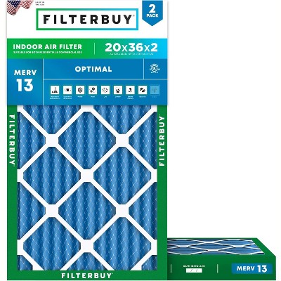 The Filterbuy replacement air filter 20x36x2 (actual size: 19.50" x 35.50" x 1.75") ensures that your furnace, air conditioner, heat pump, or HVAC system is circulating the cleanest air possible to help preserve your budget and healthy lifestyle. MERV 11 synthetic media (comparable with Micro Allergen Defense MPR 1200 & FPR 7) is recommended if you have pets or allergies with its capability to trap 95% of dust particles while protecting your home or business from smoke, smog, lint, pollen, mold, dander, and other forms of debris without impacting air flow. High quality construction features an electrostatically charged design with 10 pleats per foot that captures more harmful particles and prolongs the products lifespan by three times that of fiberglass models (replace every 90 days for best results). Plus, our industrial grade beverage board frames are paired with dual wire backings that significantly outperform traditional cardboard compositions by improving structural integrity with their ability to endure temperatures up to 200 degrees Fahrenheit and withstand exposure to moisture. Installation is also made simple with the addition of easy-to-understand arrows that help identify the direction of air flow and subsequently the way the filter needs to be placed. To top it off, all our components are 100% manufactured within the United States and designed with recyclable materials, providing an eco-friendly alternative to enhancing your air quality.