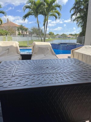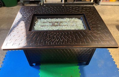 I am so pleasantly surprised at how solid and substantial this table is. It has a beautiful finish and weave pattern.It will be perfect for my crafting, food service, or playing cards. Easy assembly and It lit right up with the battery operated ignition and has a quality door closure to keep little hands out. The pit lid is solid and fits nice and flush. It came with 2 nice sized bags of glass ( no skimping) and a nice beige/tan cover that happens to Match all my other furniture covers . It cam expertly packaged in excellent condition. I love it!