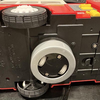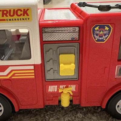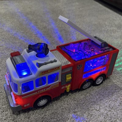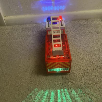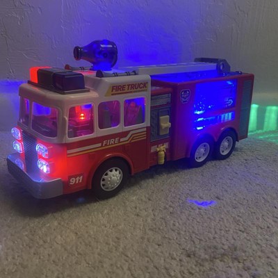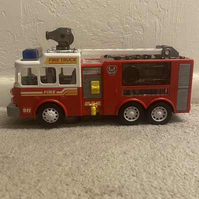 [This review was collected as part of a promotion.] Pleasantly surprised by the features on this toy. Has standard lights and sirens. Also has a motorized wheel on the bottom that makes it zigzag and scoot around on the floor (hardwood or tile, not carpet) in random directions. However, if you don’t want this it can be stopped by leaving on the gray plastic ring that you see in the one of the pictures. The ladder tilts up and the spray gun above the drivers cabin rotates. Seems like a pretty fun toy for a toddler at a good value. I received an incentive to write this review.