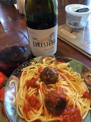I enjoyed this light-bodied Pinot Noir from Firesteed. The light red color is indicative of the taste. It's not heavy and definitely has some fruitier notes like ripe black cherry. I also got hints of peppercorn and vanilla, with just a wisp of smokiness. It paired well with my Italian pasta and meatballs. It didn't take away from the food, but added a nice, balanced acidity to the meal.