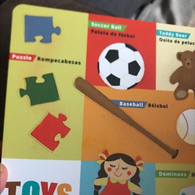 If you’re a bilingual family this is perfect for a toddler. It’s a board book & a good size. It covers food, shapes, color, transportation, body parts, animals, clothes, family, garden, home, & toys . I highly highly recommend !