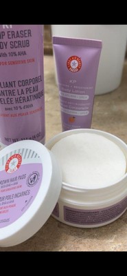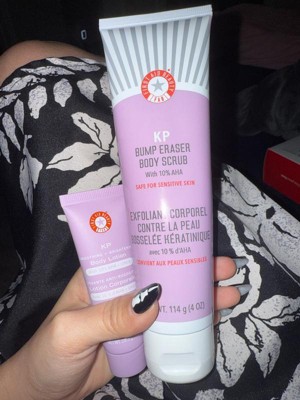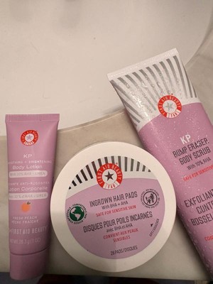 A: KP Bump Eraser Body Scrub with 10% AHA - 4oz, Ingrown Hair Pads - 28ct, Smoothing Body Lotion - 1oz