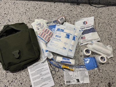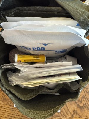 [This review was collected as part of a promotion.] Overall a good first aid kit to add to a collection. This would not be the only kit you would want, as it is lacking some of the more basic items, but one that would be nice to throw in your bug-out bag, your camping gear, in your vehicle, etc. The bag could use some help. It is just two pockets, one large, one small. Not easy to organize , but it's not a big issue since is it so small.