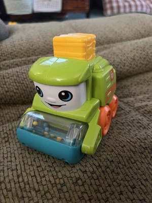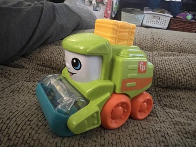 [This review was collected as part of a promotion.] There are some strange inaccuracies about this toy. First of all, it’s a combine, not a tractor. It also has a simulated hay bale on the top even though grain is what is stored in the back of a combine when it is harvesting. As a toy, it’s ok. Colors are simple, as is the design. The hay bale squeaks when pushed, the thrasher has beads in it that make noise when it rolls. The face on the “windshield” is cute. I’m not sure why, but the first set of wheels do not rotate. Overall, it’s an ok toy for a young toddler, like as a “first” combine. My child is almost 2 and is not held long in interest by this toy. It’s pretty basic. I probably wouldn’t buy it over something similar unless the price was much better.