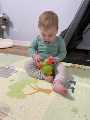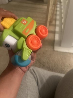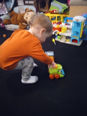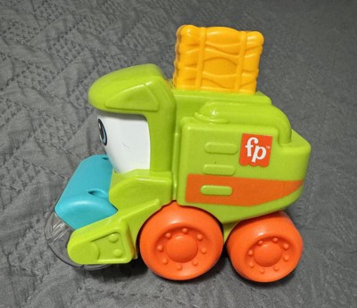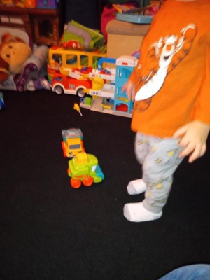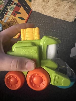 [This review was collected as part of a promotion.] Cute little tractor toy. It rolls and entertains baby with the noise maker. Has button on top that also makes noise. It’s a small size so my son can pick it up with no difficulty. Overall it keeps my child entertained and he enjoys playing with it.