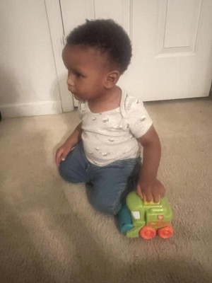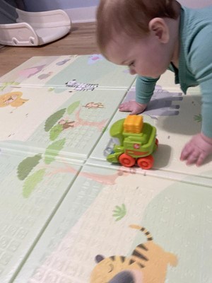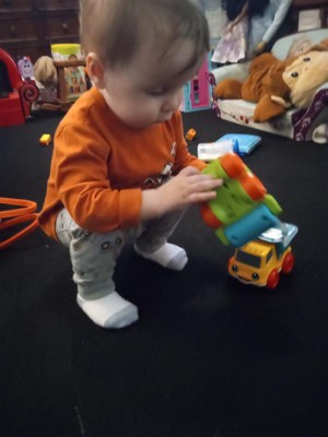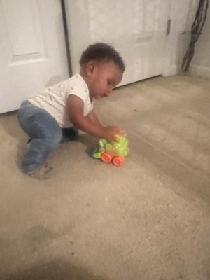 [This review was collected as part of a promotion.] Our little girl enjoys the toy and while she might not play with it on her own a whole bunch, dad likes to roll around in front of her which makes her smile so along her arms and back she finds hilarious. It would be nice if instead of making a squeak noise it made more of a truck noise or some type of music or engine sound. But overall she’s enjoying it