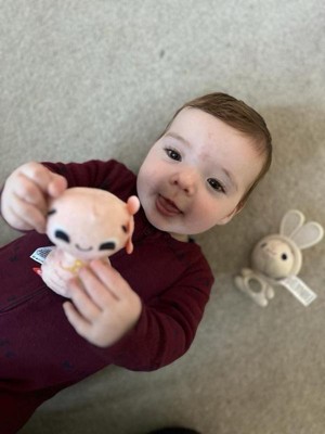 BPA-free bunny teether has textured ears and removeable jingle ball for added fine motor play
