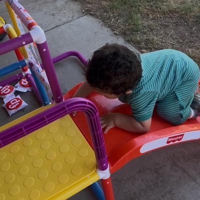 Bring the playground home with the Fisher Price Jungle Gym. Keep your child engaged in healthy, active play right in your back yard or basement. Customize your play structure by placing attachments however best fits your space. Included tool ensures quick & easy assembly. Features attachable slide that squeaks as you step and toss game panel with Fisher Price bean bags. Durable multi-color poles are ideal for safe climbing and stability.