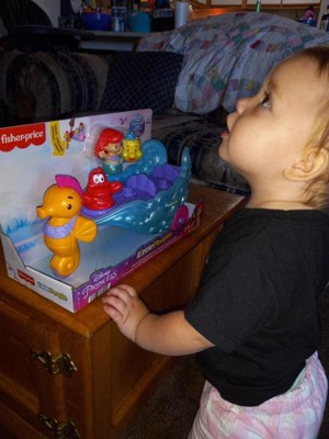 [This review was collected as part of a promotion.] This toy is a huge hit! My (just turned) 3-year old daughter has been playing with it every day since it arrived about a week ago. It’s sturdy, well designed & has the sweetest little details. It’s an adorable rolling carriage pulled by a sea horse. It comes with 2 figures, Ariel (The Little Mermaid) and her buddy Flounder. My daughter pushes it around on our hard floors easily. When you tap Sebastian the crab it plays ocean sounds or music (‘Under the Sea’) and the body of the carriage lights up and changes colors. What kid wouldn’t love that? The music and sounds are pleasant, not loud or annoying. Sebastian isn’t removable, he’s fixed in place in the carriage. Not a big deal but my daughter did try to take him out to play with him like the Flounder and Ariel figures. One really nice feature is that there are extra spots for more Little People figures. My daughter has been playing “princess parade” and loading the carriage up with all her princesses. It’s been fun to see how my daughter uses her imagination with this toy. One last thing I have add is how much I love Fisher Price toy packaging. Just a couple of twists and the toy is ready for play, no scissors required…genius.