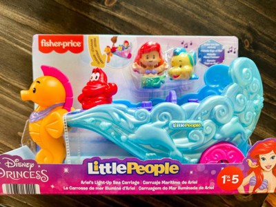 [This review was collected as part of a promotion.] Little Mermaid, Little People set. Love the little carriage plays music clips from the movie. The carriage also lights up. If you press Sebastián he plays noise the clips of music and lights it up, Sebastián is not removable so you cant play with him out of the carriage. It also came with Ariel and Flounder that you can put in or take out to play without the carriage. There are 3 Little people spots to set them on to ride in the carriage but only came with two characters so if you wanted to mix the Little People sets you could. We enjoyed this toy overall.