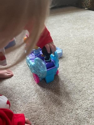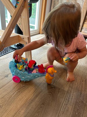 [This review was collected as part of a promotion.] This Ariel set is super cute and my daughter loves the musical aspect and lights. Simply pressing Sebastian sets off the music. There's space for three characters to 'ride' in the carriage but they are a bit hard for my toddler to secure on the pegs. She does love how the carriage is able to be pushed and wheeled around and we sometimes 'race' it back and forth to each other when we play. The colors are cute, bright, and fun. Overall, this is a nice, solid, well designed set.