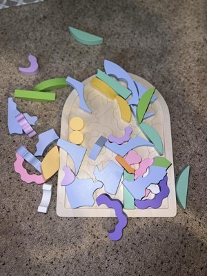 [This review was collected as part of a promotion.] This puzzle is beautifully crafted! The paint is a smooth, pastel finish that is a perfect Spring time find. The wood is thick and easy for little hands to grab. I love that the board has shape markings to help my daughter line up the pieces. All of the pieces perfectly lock together.