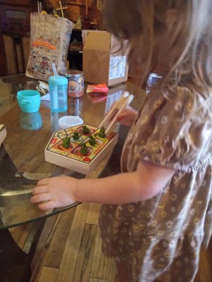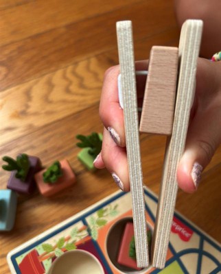 [This review was collected as part of a promotion.] My child is obsessed with this toy! The chopstick like things are a great feature & I have noticed such an improvement since we 1st got this toy, he use to drop the plants and have alot of trouble with it, but now he can pick the plants up with the sticks with no problems & moves them where he wants