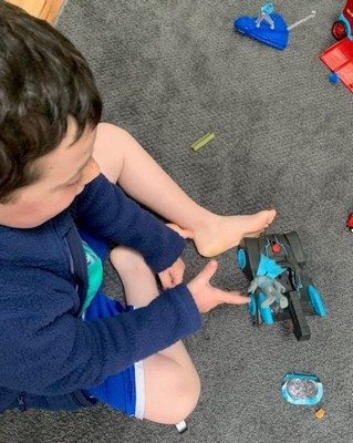 [This review was collected as part of a promotion.] My five year old couldn’t wait to open this and play with it. He was very excited that it had a transforming feature and that it shoots discs. Definitely a great toy that I will look to buy for birthday parties and holiday gifts.