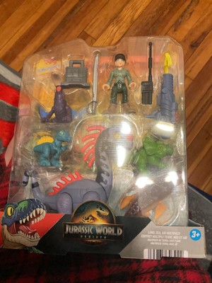 [This review was collected as part of a promotion.] This is a set of 5 different dinosaurs- large, medium and small in size. Several of the have moveable parts. Their legs, head, fins, and wings will move around to position them differently. The girl also has moveable parts. She bends at the waist, her head twists and her arms move up and down. She can also hold the walkie talkie, a sword, a radio and a dart gun that is all included in the set. The dart gun will actually shoot the dart out when you pull back in the red lever on the top. It is a cute Jurassic World collection of dinosaurs and accessories. My grandson loves dinosaurs and loves playing with them. I think it helps him build his imagination and keeps him telling and playing stories.