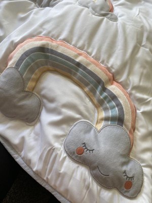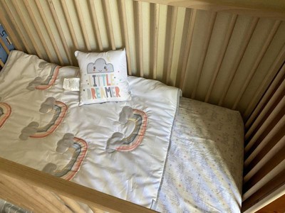 This set is really cute! The design is sweet and the variety of quotes on the sheet are cute. My favorite piece though is the little quilt! The rainbow at the bottom is velvety soft and has a sweet face embroidered onto it. I’m not sure how long it’ll last however. I washed and air dried everything prior to use, and I noticed that the pillow was torn in the process. It does have a removable cover (I didn’t notice the zipper beforehand), so I’d definitely recommend removing the cover and placing it in a garment bag for washing so the same doesn’t happen for you! With the toddler’s crib in the lower position, the bed skirt gathers on the floor, so it’s probably best for littler ones!