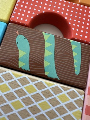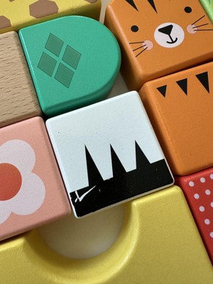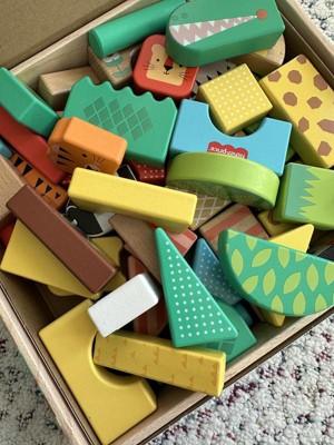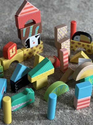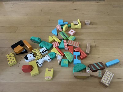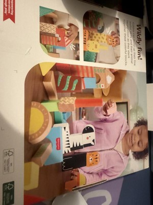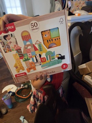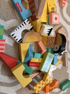 Toddlers can stack up hours of wild building play with the Wooden Jungle Blocks set from Fisher-Price. This animal-themed building set includes 50 colorful blocks made with wood from Forest Stewardship Council-certified sources (FSC-N004566) and decorated with non-toxic, water-based paints. Kids can stack and build 6 different exotic animals, including an alligator, giraffe, lion, zebra, toucan and tiger, plus their matching habitats. For added fun, kids can mix and match the stacking blocks to build wild new creations! Colors and decorations may vary.