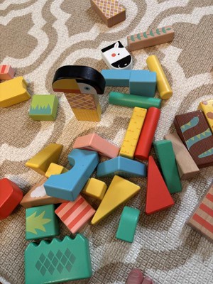 - 50-piece wooden building blocks set featuring exotic animals and their habitats
