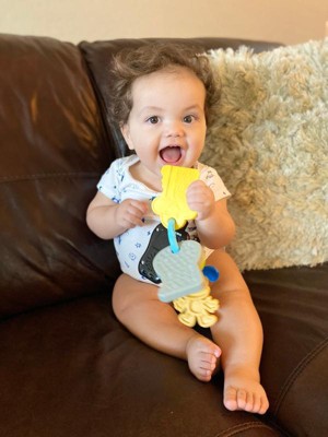 [This review was collected as part of a promotion.] These keys are such a simple toy but keep my daughter enterained for longer than I expected. They are great to give to her on car rides and other times when she needs something to keep her busy. They are very durable and a perfect fit for a child her age!