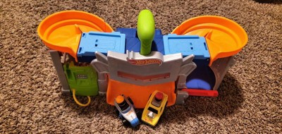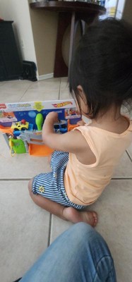[This review was collected as part of a promotion.] Hot wheels race and go track is great for little ones that are interested in cars. The toy is blue and orangne just like the original Hot Wheels with a bright green handle to launch your cars to race down the bright orange curvy ramps and also to carry the track where ever you want to go. One race car is yellow and the other is blue. As the cars are launch music starts to play. Two additional pieces of the race and go track let your little racers gas up their cars at a bright green gas pump and come in for repairs to a little garage. Our daughter played with the track on the floor. She enjoyed the cars since she loves Hot Wheels and loved racing her car against daddy's. She played with it for a 5 to 10 minutes. She liked the toy overall, but wished it had a longer track for the cars to race down to the finish line. Very limited sound effects/music is played which was surprising.