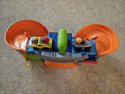 - Ready, set, go! Press the handle to send cars racing down and around the track with cool lights and sounds