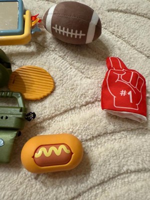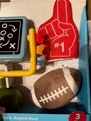 - Includes crinkle cooler, plush football, crinkle “foam finger,” roller hot dog, teether snack chip, and a mirror styled like a goal post with a suction button