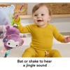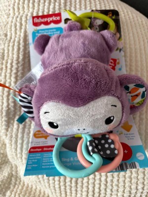Take your baby’s favorite tune on the go with the Fisher-Price Sing & Go Purple Monkey stroller toy, which features the popular Purple Monkey song from the best-selling Deluxe Kick & Play Piano Gym*! Just pull & release the clackers to activate the song and other fun sounds. This plush baby toy also includes lots of sensory details like gentle jingles, cuddly fabrics, and fun crinkle to engage and delight your newborn. Easily attach the monkey to your stroller canopy, baby gym or diaper bag for travel play. Includes 2 AAA batteries. Colors and decorations may vary. (*#1 baby gym in the world based on global NPD data for 2018-2023) (Gym sold separately and subject to availability.)
