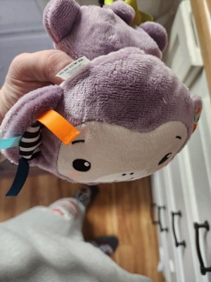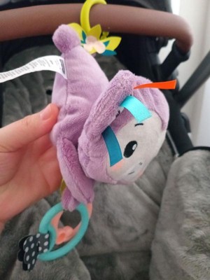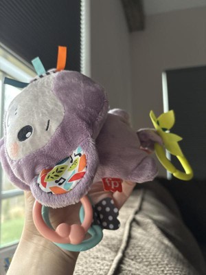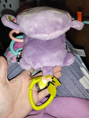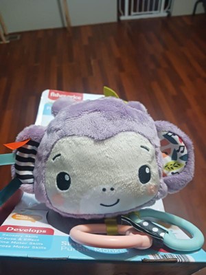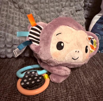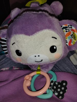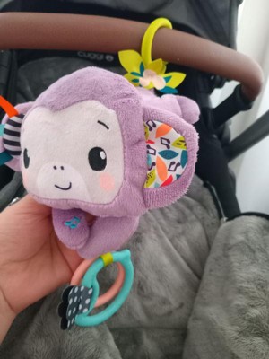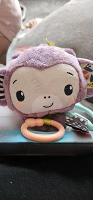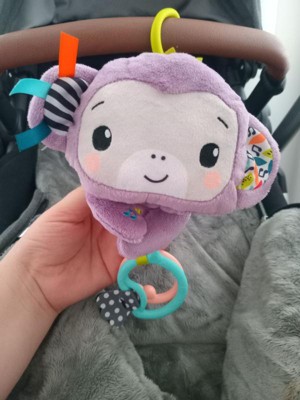 [This review was collected as part of a promotion.] This is such a cute little toy for newborns and up. The purple color is so sweet and the monkey face is adorable. It plays songs that keep the child's attention and makes cute crinkly sounds. It is perfect to attached to a stroller or car seat. Definitely recommend for some cute entertainment.