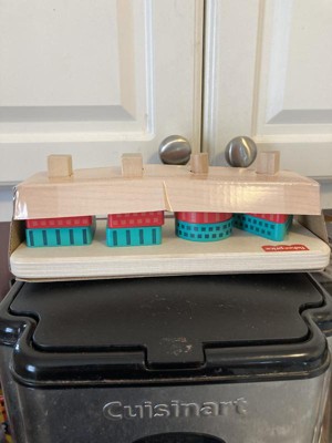[This review was collected as part of a promotion.] Cute and functional toy. My 6 year old daughter is disabled and she has been using this to improve her fine motor skills. She has to manipulate the pieces to fit the correct shaped peg. The colors are bright and playful and the entire thing is made of wood that is varnished so that little ones do not get hurt. It is great for toddlers and older, children needing to work on fine motor skills or just have fun stacking. It is very small so good for traveling with.
