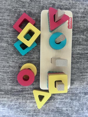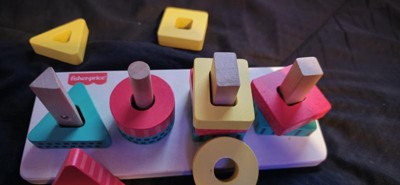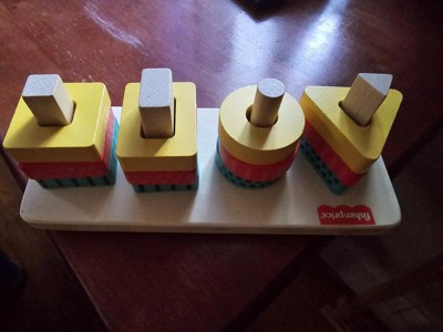 The Wooden Shape Stacker from Fisher-Price features colorful wooden triangles, circles, rectangles and squares for toddlers to sort and stack on to the base. Made with wood from Forest Stewardship Council-certified sources (FSC-N004566) and decorated with non-toxic, water-based paints, this stacking toy helps foster fine motor activities and introduces colors, shapes, counting and more. Colors and decorations may vary.