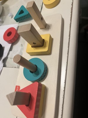 I really wanted to love this. I've been trying to avoid too many plastic toys so i thiught thia wooden one would be perfect. The quality is great, but it is a bit on the small side. And some of the shapes can be stacked on other shapes post. So it doesn't help sorting if the triangle fits on triangle and circle posts.