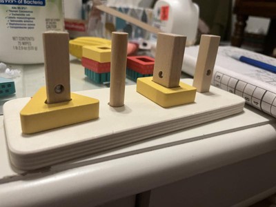 [This review was collected as part of a promotion.] This is a great product for little ones to help with their developmental growth. I have a special needs child and this is one of the few toys that he does not become frustrated with while trying to get the correct shapes on the pegs. He will sit in his high chair for at least an hour and work so hard to get all the pieces where they belong. The pegs also bend a bit, so this is a great help instead of them just being straight up. It is still a challenge for him at times, but where they bend it helps him get his hands positioned to complete the task. He loves the colors of the wooden shapes and enjoys making patterns with them.