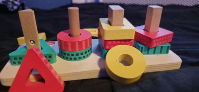 [This review was collected as part of a promotion.] My nephew absolutely adores the wooden shape stacker! He spends hours entertained by it and can't seem to get enough. The vibrant colors not only catch his eye but also make the toy very visually appealing. Plus, I'm impressed by how sturdy it is.