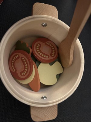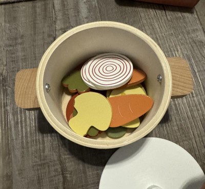 [This review was collected as part of a promotion.] This is a cute little pretend soup kit that my daughter (4) enjoys playing imagination with. She likes sorting the different vegetables and she makes up stories around which people like which vegetables. The wood is a nice quality and the set looks nice. There is a frustration with the vegetables not scooping easily out of the pot with the ladle, but that's another prompt for imagination I suppose. Overall it's a fun addition to a play kitchen or play food set that's well-made and looks nice.