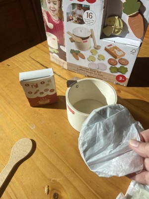 - 16 wood pieces! Includes pot with lid, ladle, spoon, box of chicken broth, and play food pieces