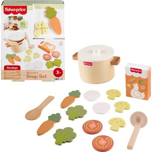Mini chefs can “cook” up endless creations with the Tiny Garden Wooden Veggie Soup Set from Fisher-Price. This 16-piece pretend kitchen playset features familiar cooking equipment, like a soup pot with lid, a ladle and spoon, plus a variety of play food pieces including a box of broth and 5 different types of veggies. Kids will love mixing the ingredients into the pot to create their own tasty recipes! Made with wood from Forest Stewardship Council-certified sources (FSC-N004566) and decorated with non-toxic, water-based paint, this wooden role-play set encourages imaginative play while fostering expressive language and relationship skills. Not intended for use with real food. Colors and decorations may vary.
