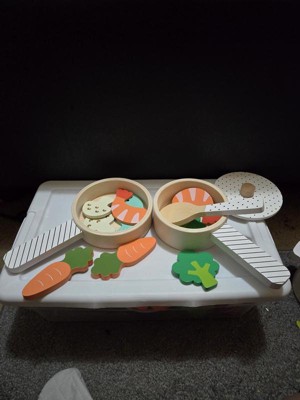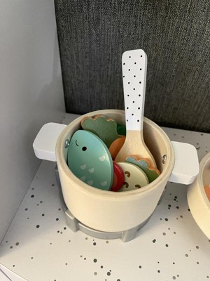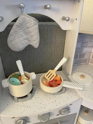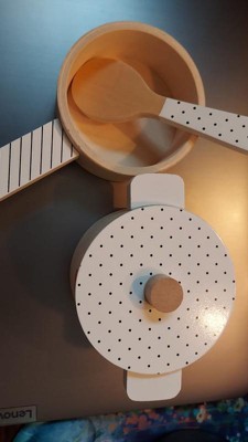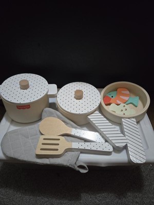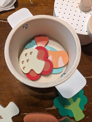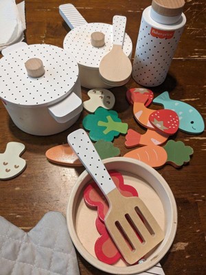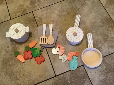 [This review was collected as part of a promotion.] This is a great little set of pots and pan that provided a lot of play options. The wooden pieces are well made and lightweight, making it very easy for kids to play with. The lids on the pots fit very nicely, and is a great touch to make the interactivity level even more fun. I love the variety of food pieces, and the pictures on them are very cute! The soft colors are nice, images are simple yet easy for kids to identify the food item. The oven mitt is a great little addition to the set! That said, as they were playing, my kids pointed out that they wished there were two pieces of the fish, since every other food has two of each. They also wished the spoon was curved a bit so that they could stir and scoop the food pieces better.