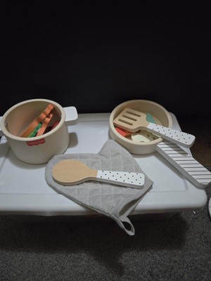 Fisher-Price Wood Kitchen Pretend Play Toy Pots & Pans Set, 19-Piece Playset Wooden, Metal & Fabric for Preschool Kids Ages 3+ Years