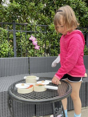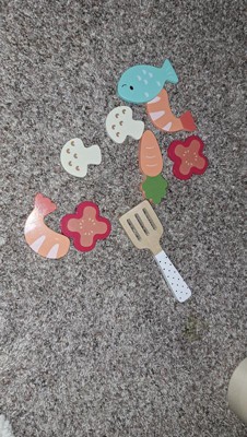 [This review was collected as part of a promotion.] When the package arrived, both my 5 and 8 year olds jumped up to open it! They ripped open the box and were thrilled to see the beautifully painted pots, pans, and food. My son loves seafood and could not believe that there were shrimp and fish!! For the rest of the day they carried around the set and played with it both indoors and outdoors! Since then, the kids have played with the set on their kitchen set, on the couch, outdoors having a picnic, etc! The possibilities are endless! Because they enjoy it so much my only disappointment with the product would be that it didn’t come with a bag to carry everything in! My daughter even dropped the pots a couple of times and not even a chip happened! I really enjoy the quality of the pots, pans, utensils, and food and love that it’s wood and not plastic.