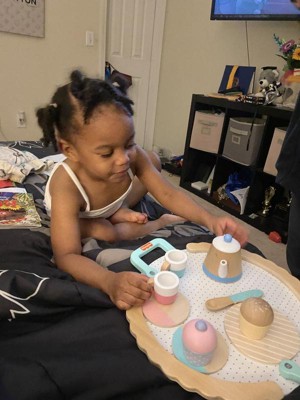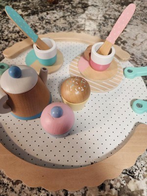 [This review was collected as part of a promotion.] I love that this tea set is wood and comes in darling pink and blue colors. My five year old girl was so excited to open it for her birthday! She likes carrying the tray around. We both think the muffins are a nice additional touch compared to most play tea sets.