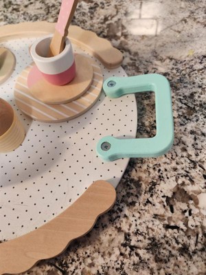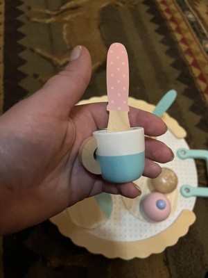 [This review was collected as part of a promotion.] This tea set is precious. It has a teapot, two mini teacups, three plates, two spoons, and two cupcakes. All of the pieces are well crafted and painted in pretty pastel colors. They’re a bit smaller than I anticipated but they are a good size for small hands. We’ve had this set at home for around a week and my daughter has been playing nonstop with it. She loves pouring tea for her dolls and has been carting it around the house. Overall, this is a well-crafted toy. My only complaint is that the inside of the teapot and the cups feel unfinished like they weren’t sanded until they were smooth like the outside.