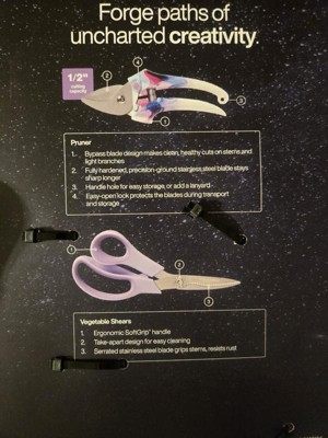 Exploration is a powerful source of inspiration, and Fiskars Explore Bypass Pruner and Vegetables Shears Set pays tribute to exploring natural and digital worlds with striking style. The set includes a bypass pruner ideal for light pruning and trimming of green stems and a vegetable shears for harvesting a variety of flowers, herbs, fruit, and vegetables. Both gardening hand tools feature fully hardened, precision-ground stainless-steel blades that stay sharp through heavy use. The pruner is lightweight and offers 0.5" cutting capacity while the vegetables shears feature a serrated blade that grips and holds stems. Additionally, the shears can be taken apart for easy cleaning, keeping your plants, harvest, and home free from bacteria.