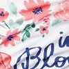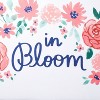 - Colorful floral print and blue "in bloom" text on a white background