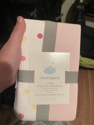 The Fitted Jersey Crib Sheet 2pk - Cloud Island™ Multi Dot and Solid Pink fit my baby’s crib perfectly. After washing the sheets they kept their original size. The material is soft and breathable. The sheets are easy to wash and remove. I love the colors and designs.