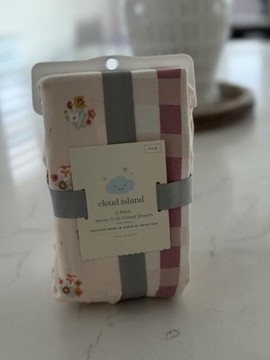 This 2-Pack of Fitted Jersey Crib Sheets from cloud island™ includes two fitted crib sheets designed to fit standard cribs and toddler beds. Made from soft jersey cotton with spandex, these standard crib sheets fit six-inch mattresses and are designed with all-around elastic for a secure fit. The pack includes two sheets — one with vibrant florals on a beige backdrop and the other featuring gingham checks in pink, burgundy and white — to add sweet flair to your little one's nursery decor.